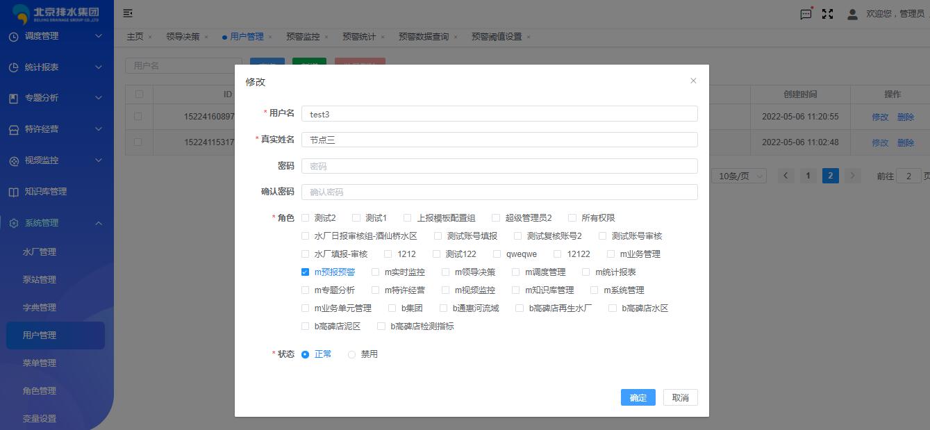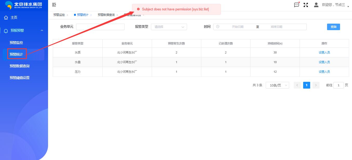 预报预警:账号(test3,123456),点击 预警统计、预警数据查询、预警阈值设置 这3个子菜单后出现相同异常提示Subject does not have permission [sys:biz:list]
