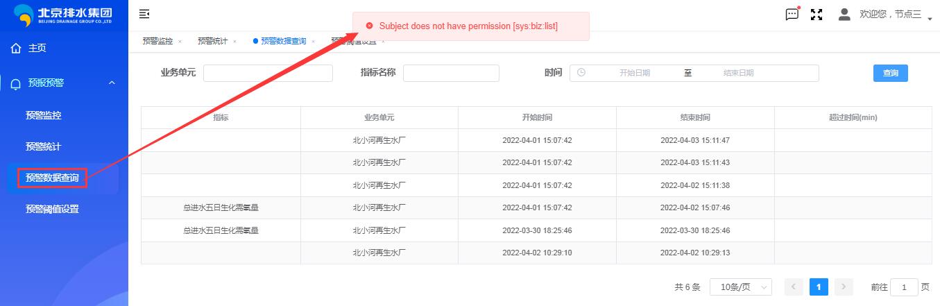 预报预警:点击 预警统计、预警数据查询、预警阈值设置 这3个子菜单后出现相同异常提示Subject does not have permission [sys:biz:list]