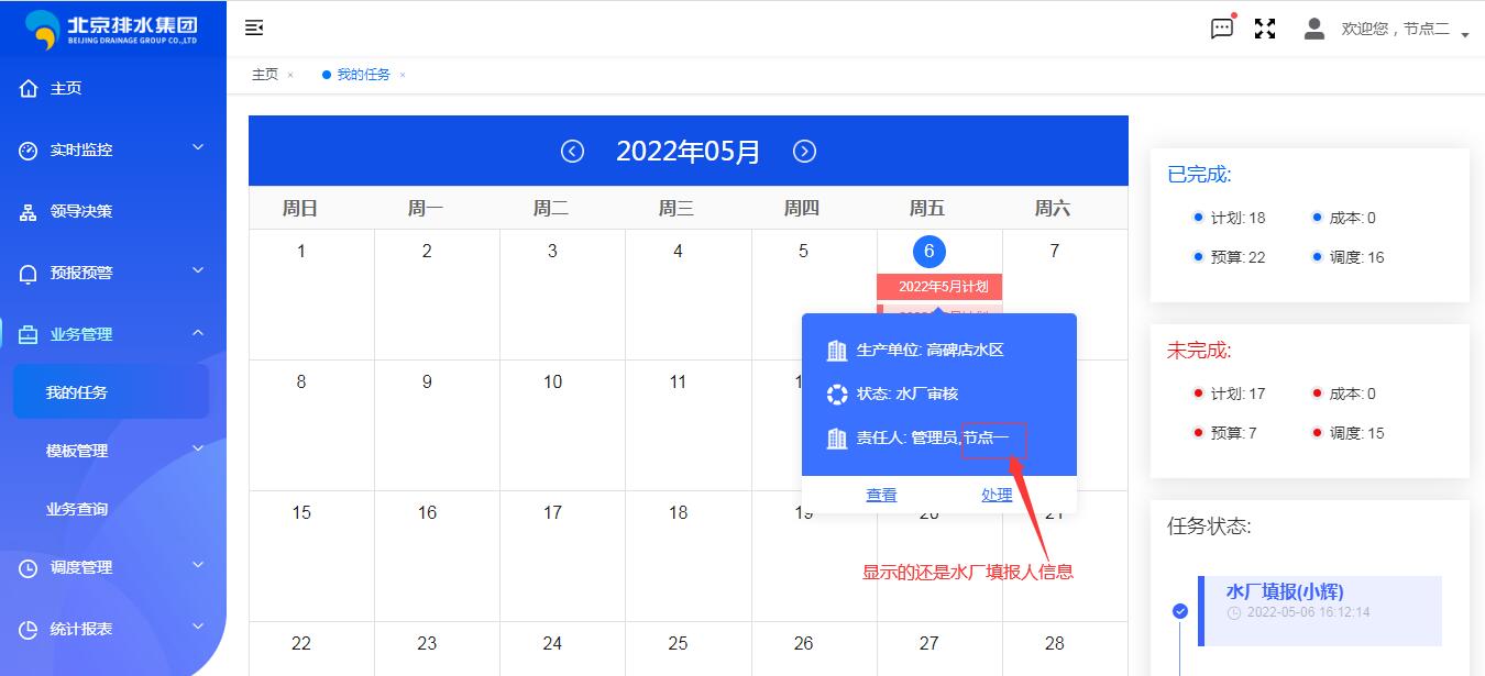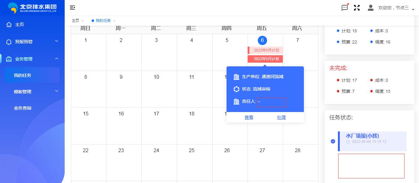 我的任务:1.水厂审核处理(节点二)提交后,自己还能看到该计划,责任人显示的是‘-’; 2.在流域审核节点,责任人(节点三)登录后,责任人显示的是‘-’,右侧任务状态为空;