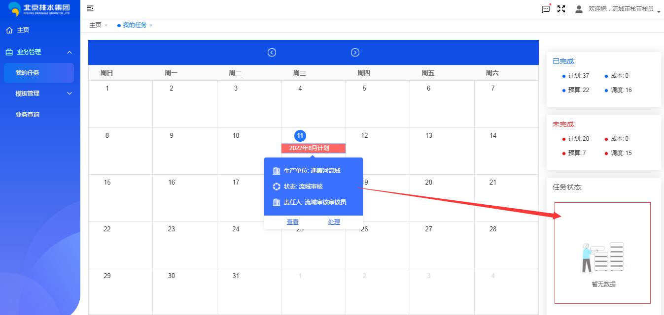 2.在流域审核节点,责任人(节点三)登录后,责任人显示的是‘-’,右侧任务状态为空;