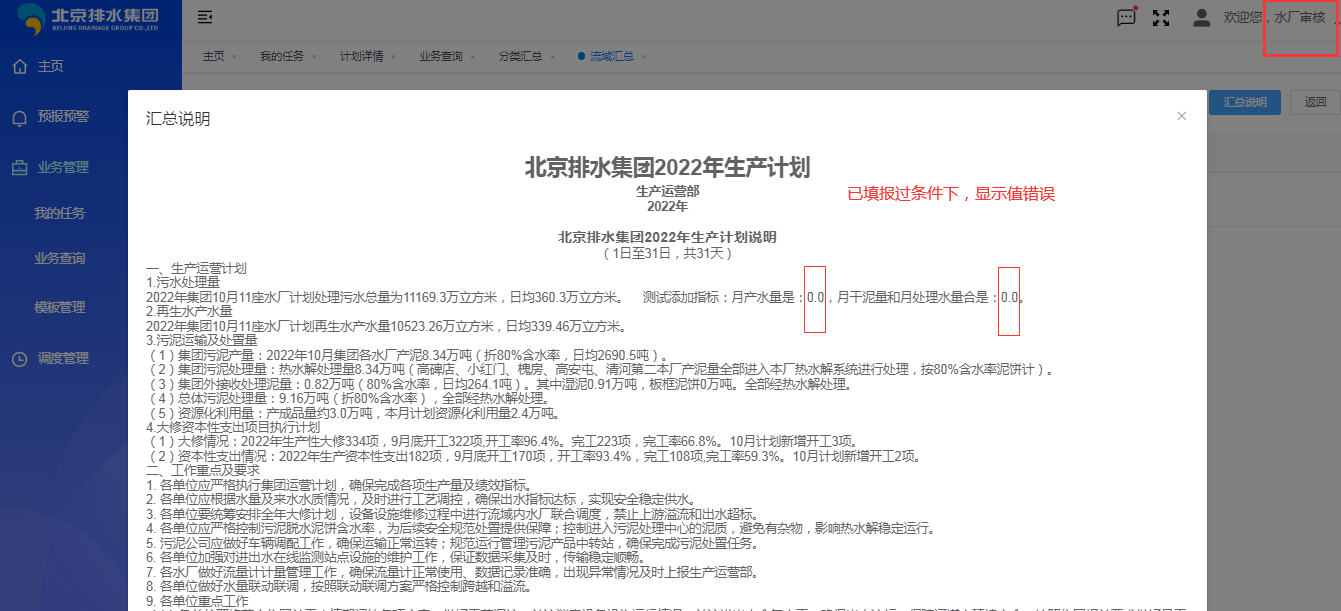 污水计划,水厂审核账号登录:业务查询-分类汇总-查看已填报过业务单元的汇总说明,变量值显示0