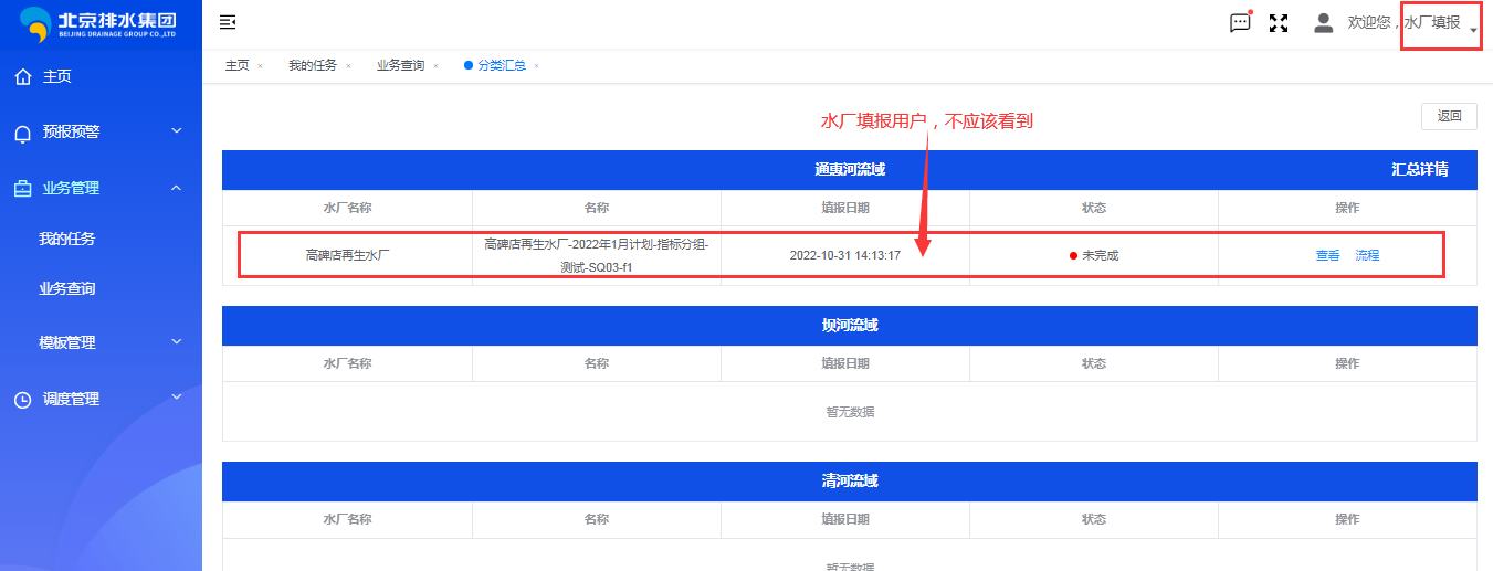 污水计划,水厂填报用户登录:在分类汇总,水厂填报用户不应该看到水厂审核过的业务单元信息