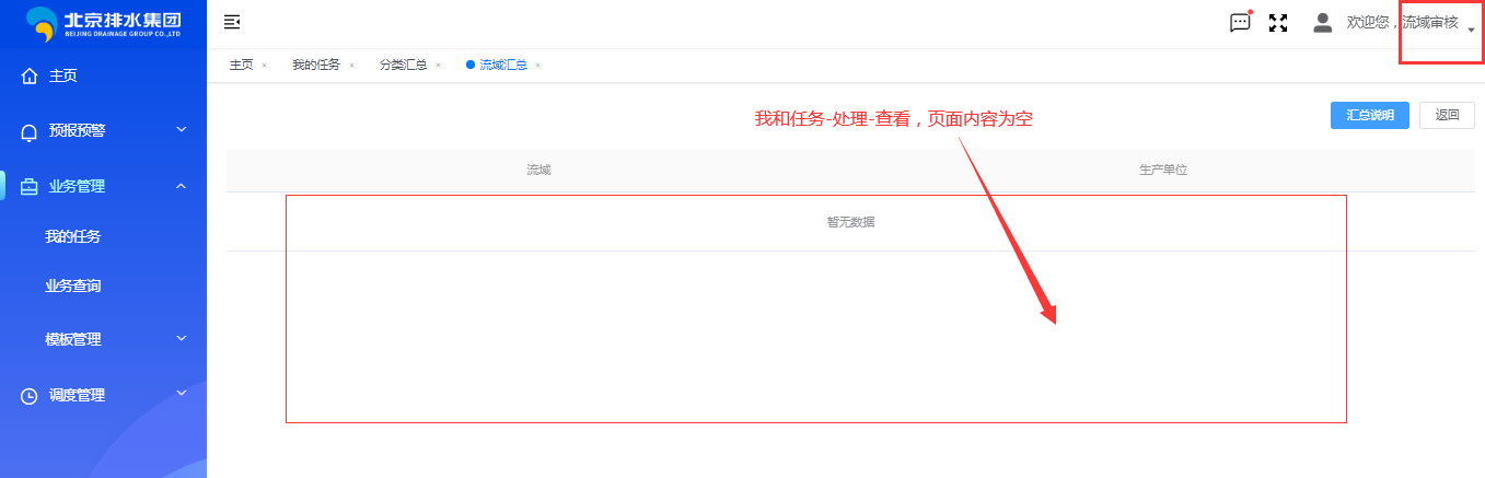 污水流域审核用户登录:我和任务-处理-查看已填报审核业务单元,页面内容为空 注:流域中只填报审核通过1个业务单元