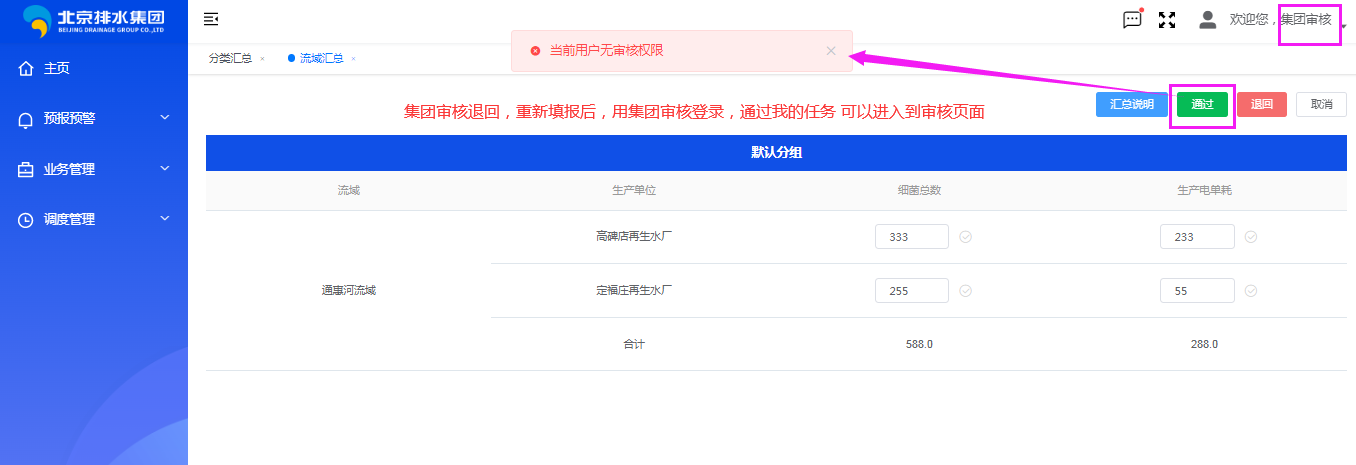 污水计划-权限问题:流域审核退回或集团审核退回,重新填报后,用集团审核登录,通过我的任务 可以进入到审核页面。