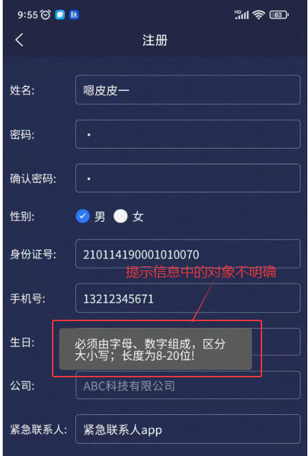 APP-注册:密码校验提示信息(必须由字母、数字组成,区分大小写;长度为8-20位!)中的对象不明确。