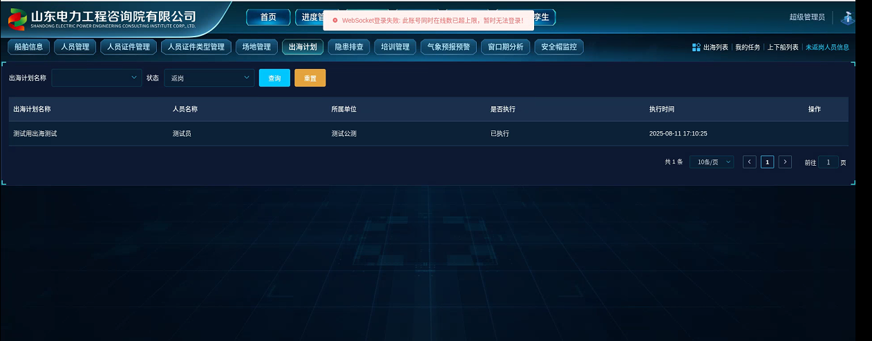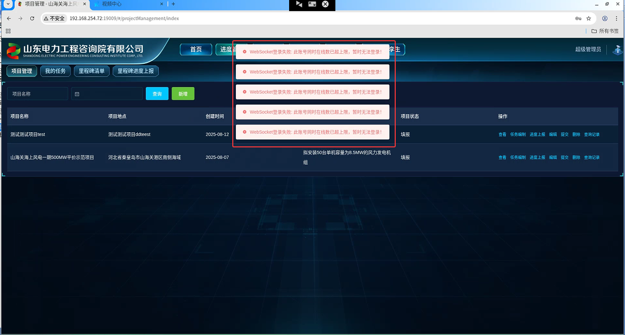 安全帽:在各个页面,不停的弹出安全帽提示信息(WebSocket登录失败: 此账号同时在线数已超上限,暂时无法登录!)。另外,其提示信息会遮挡菜单,会导致无法点击菜单。