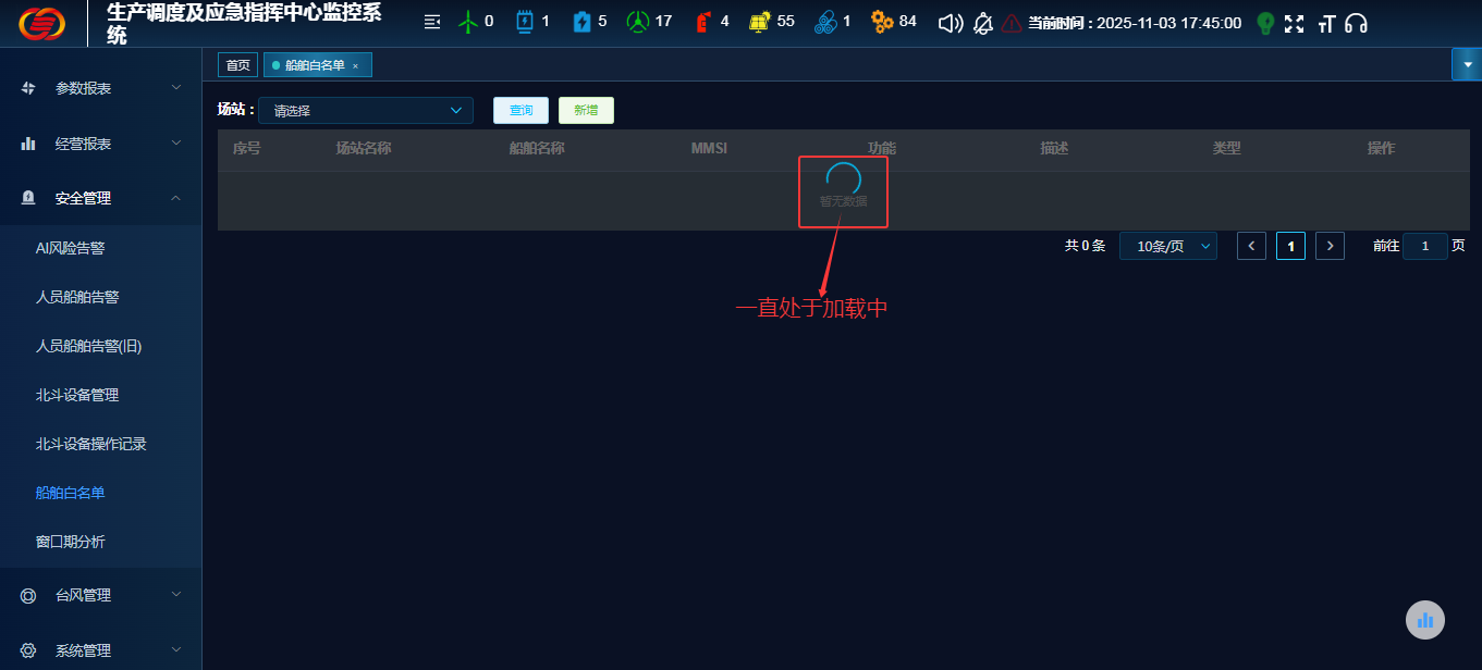 安全管理-船舶白名单:页面一直处于加载中。
