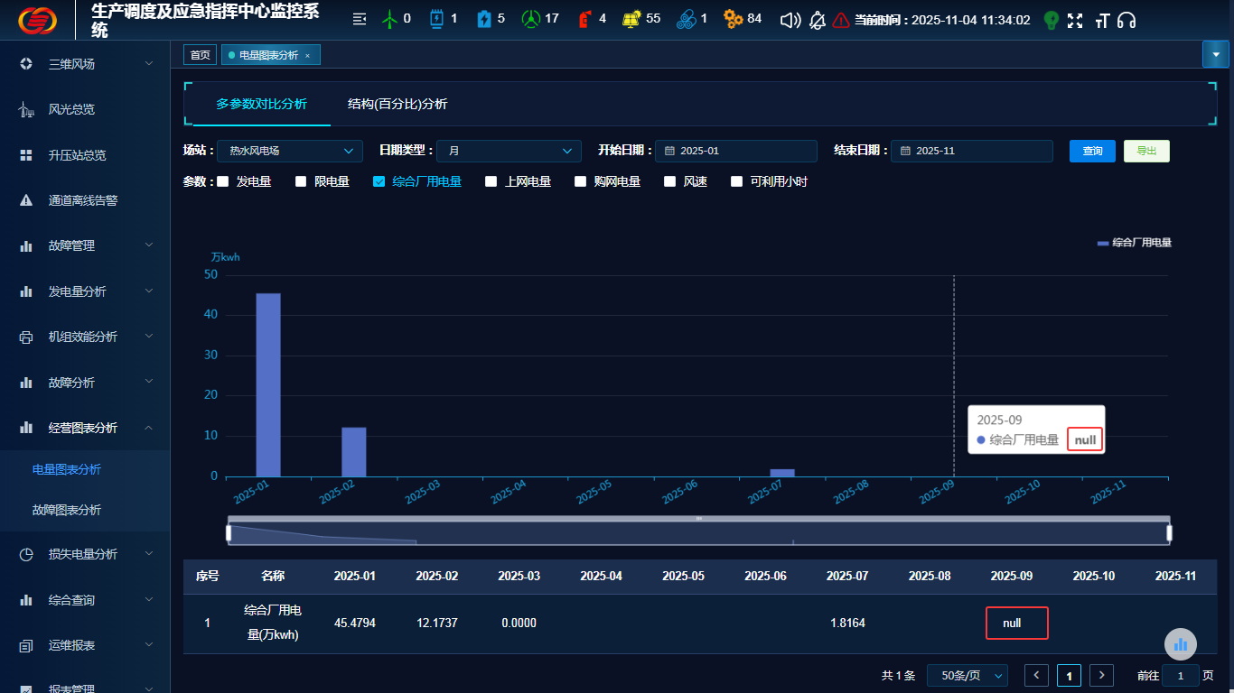 经营图表分析-电量图表分析(多参数对比分析):日期类型选择‘月’,参数选择‘综合厂用电量’,查询后,列表中‘2025-9’出现null值。