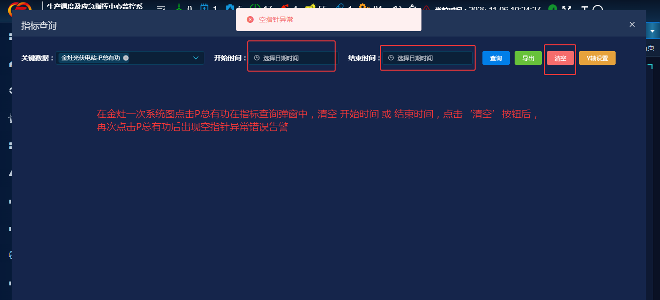 场站管理-金灶-电气一次图:在金灶一次系统图点击P总有功在指标查询弹窗中,清空 开始时间 或 结束时间,点击‘清空’按钮后,再次点击P总有功后出现空指针异常错误告警。