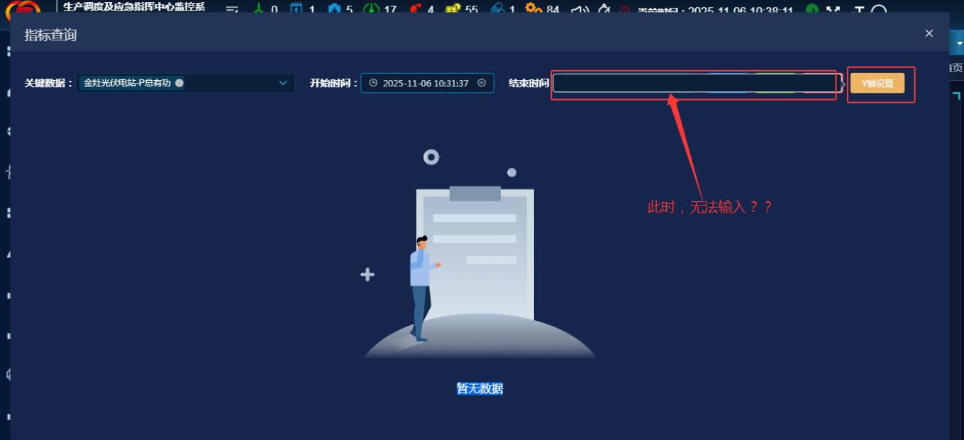 场站管理-金灶-电气一次图:在金灶一次系统图点击P总有功在指标查询弹窗中,点击‘Y轴设置’按钮后出现输入框,却无法操作。