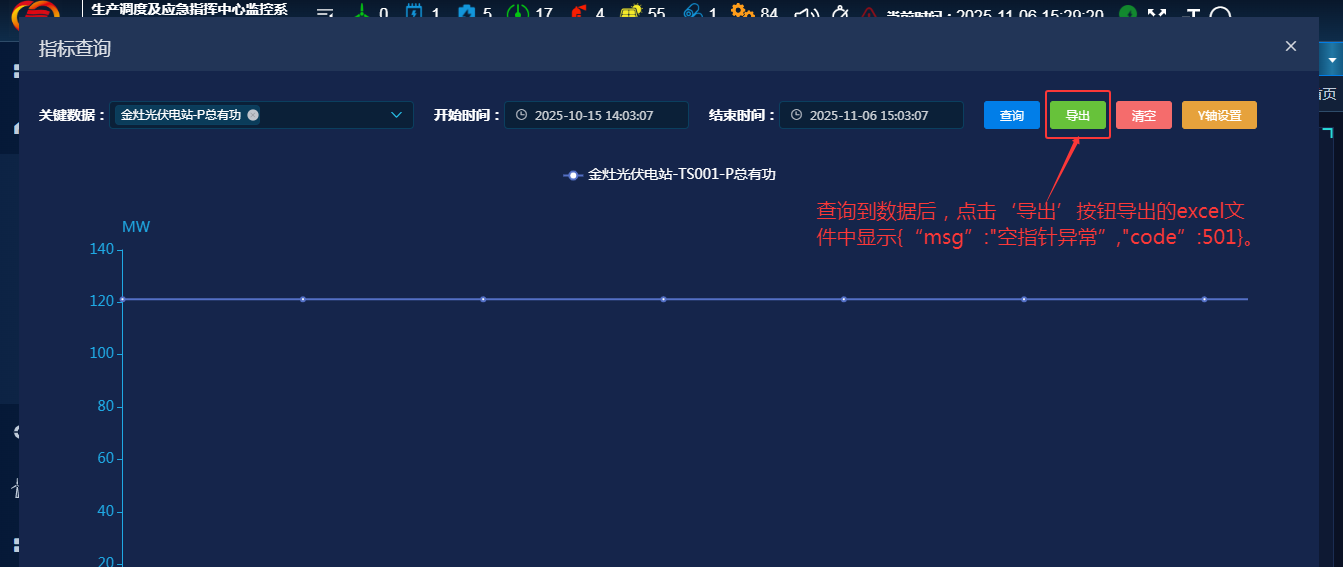场站管理-金灶-电气一次图:在金灶一次系统图点击P总有功在指标查询弹窗中,查询到数据后,点击‘导出’按钮导出的excel文件中显示{“msg”:"空指针异常”,"code”:501}。