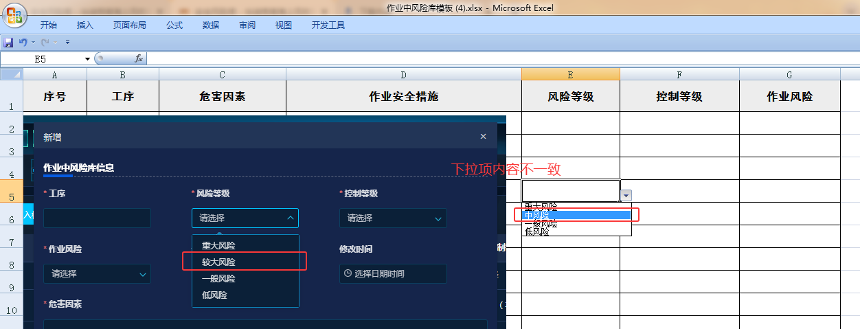 两票管理-风险预控-作业中风险库(安全风险库)-导入模板下载:下载的模板中(风险等级)选择项与系统前端页面中对应下拉项内容不一致。