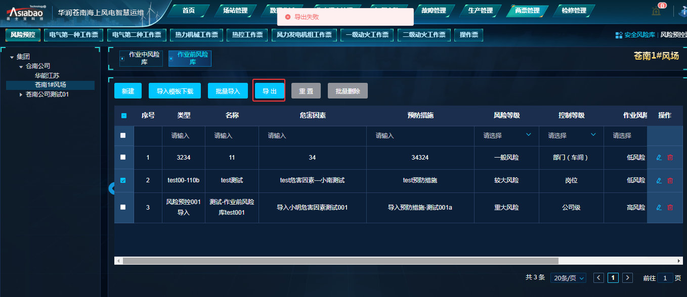 2.两票管理-风险预控-作业前风险库(安全风险库)-导出:点击‘导出’按钮后,出现提示‘导出失败’。