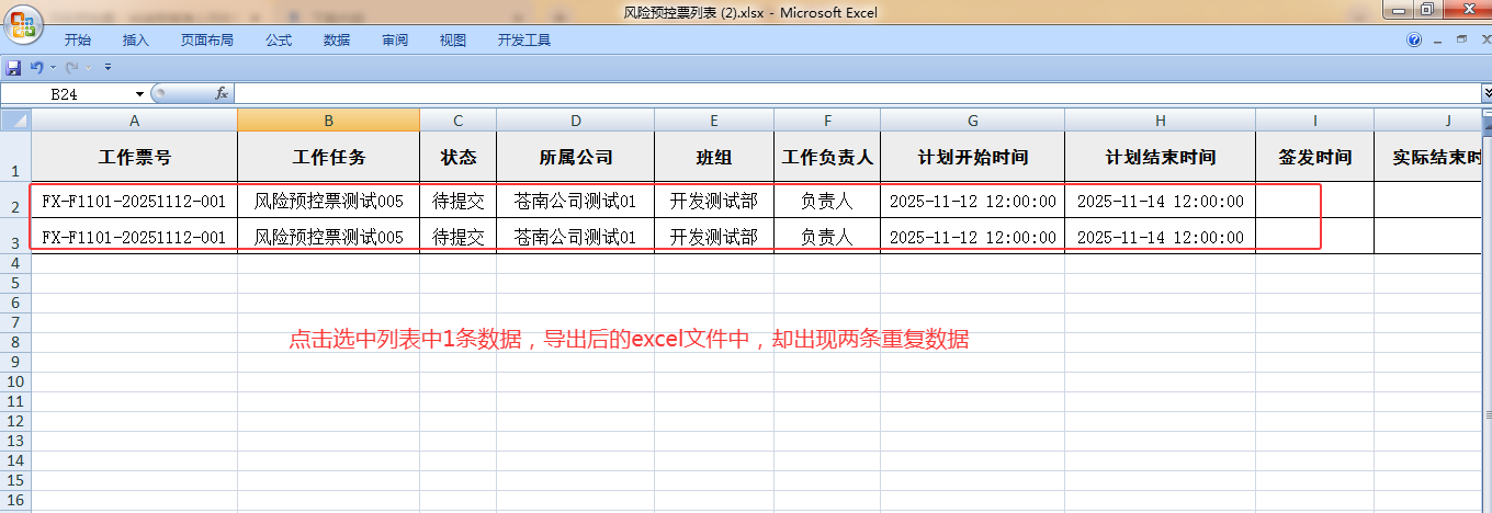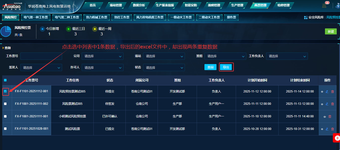 两票管理-风险预控-风险预迭控票-导出:点击选中列表中1条数据,导出后的excel文件中,却出现两条重复数据。