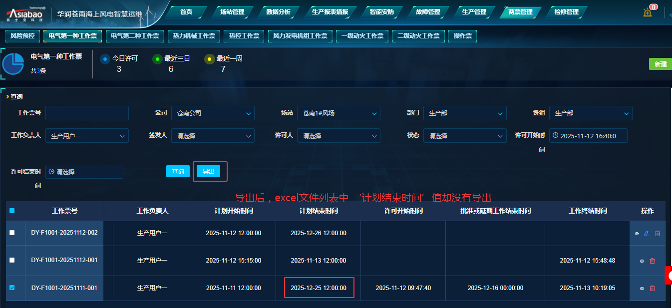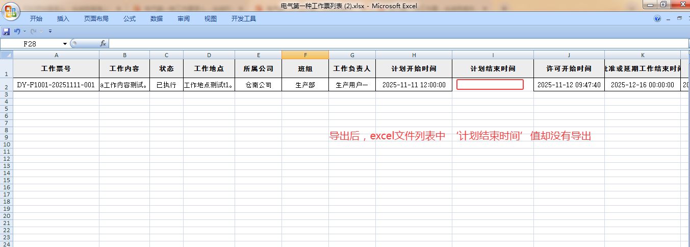 两票管理-电气第一种工作票-导出:导出后,excel文件列表中 ‘计划结束时间’值却没有导出。