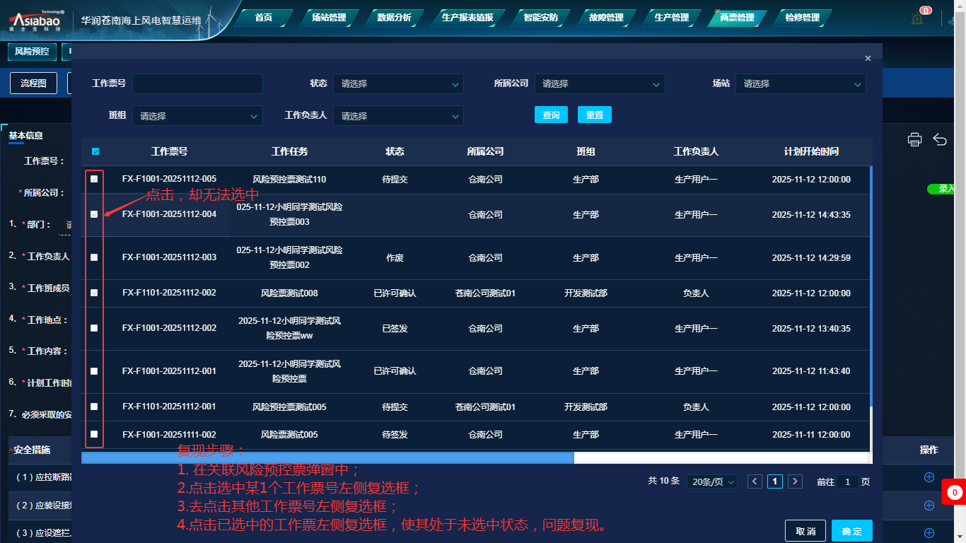 4.点击已选中的工作票左侧复选框,使其处于未选中状态,问题复现。