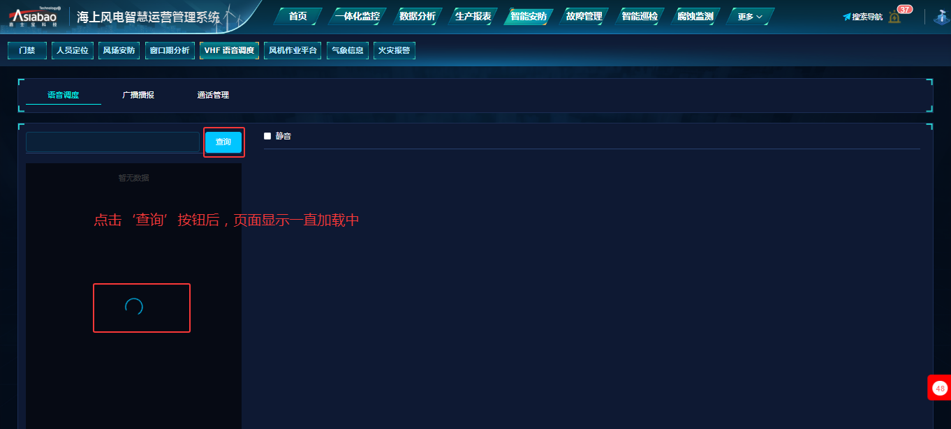 智能安防-VHF语音调度(语音调度)-查询:在语音调度页面,点击‘查询’按钮后,页面显示一直加载中。