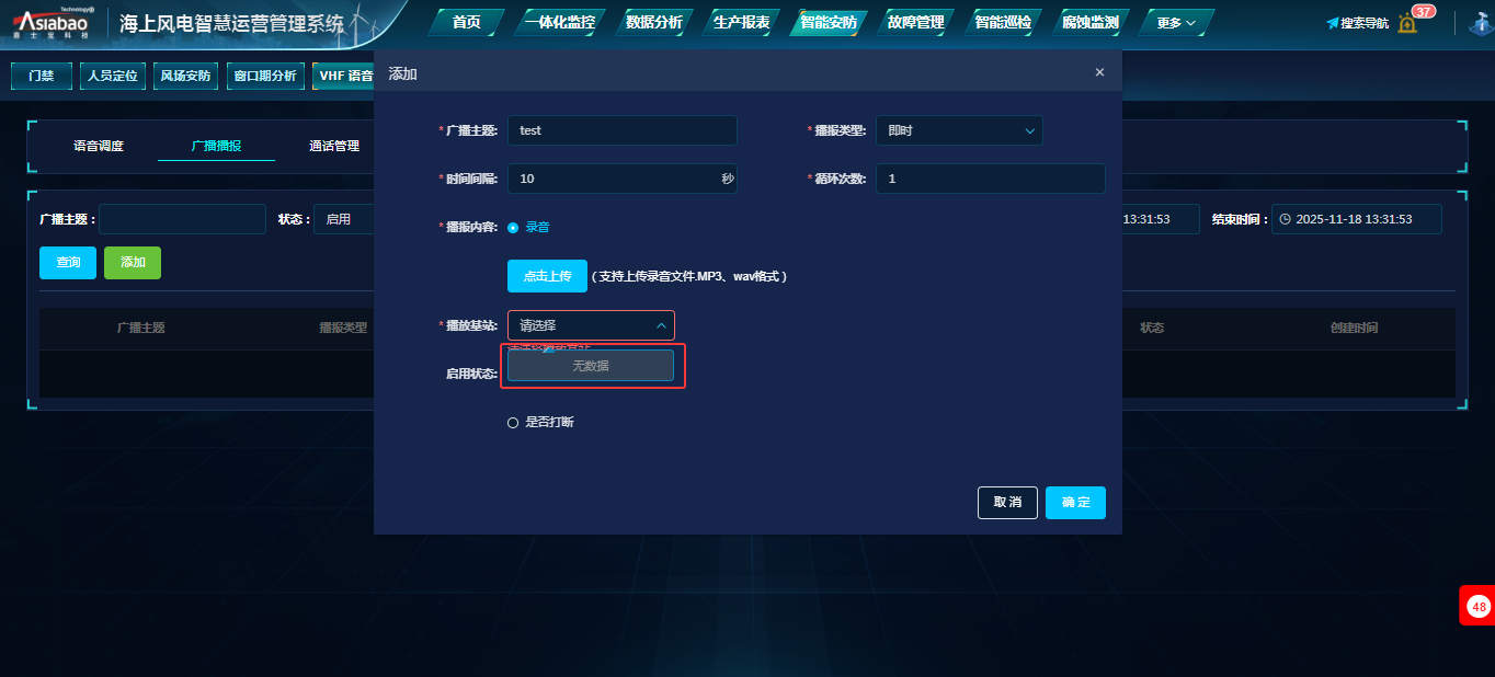 智能安防-VHF语音调度(广播播报)-添加:在添加弹窗中,播放基站下拉项显示为空。