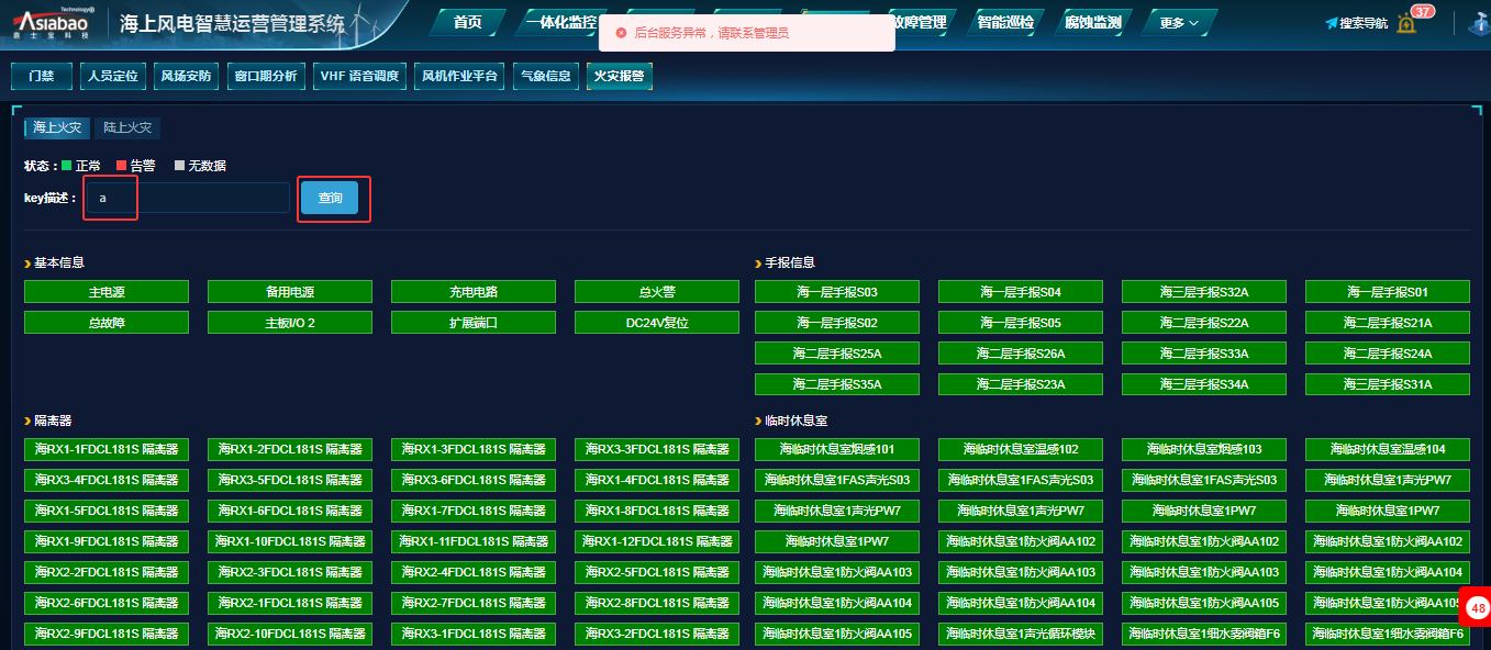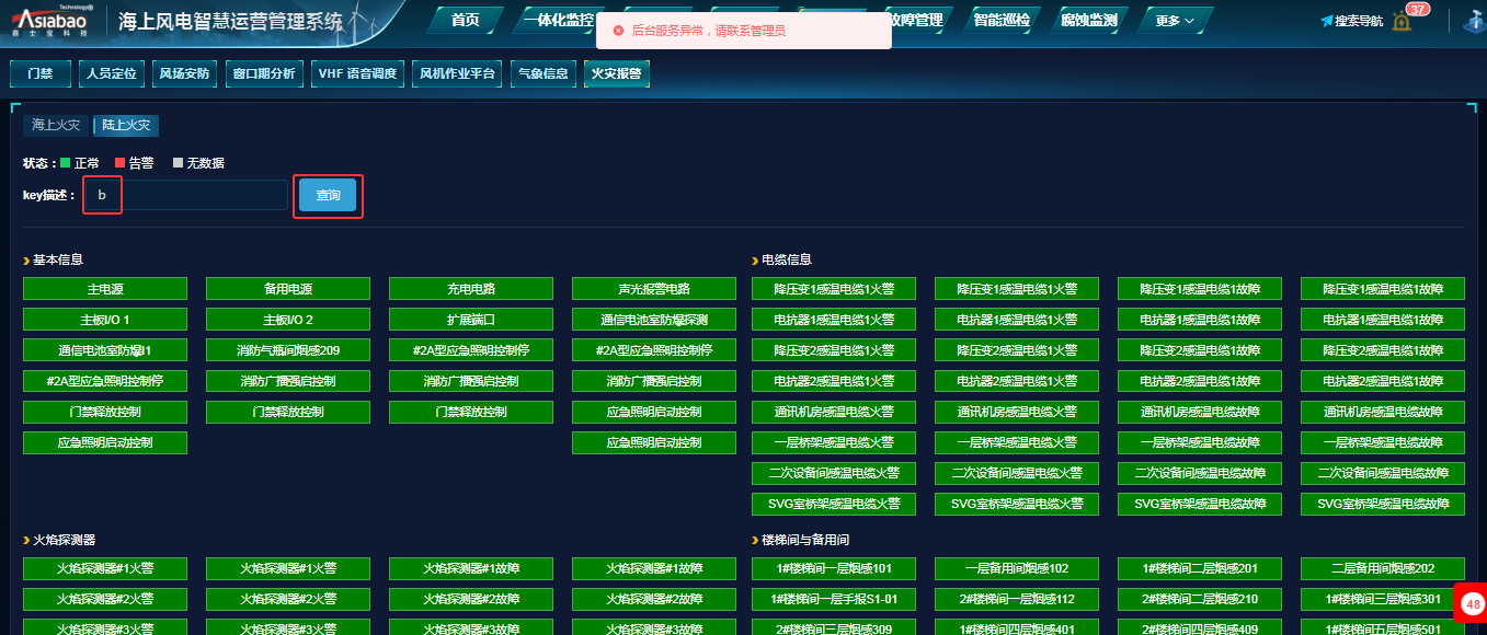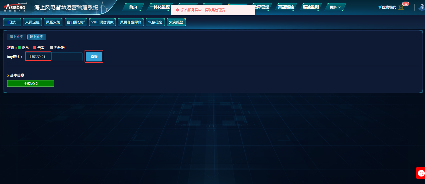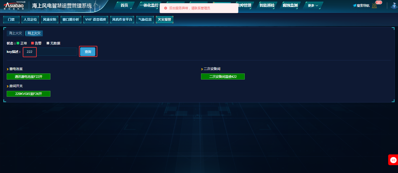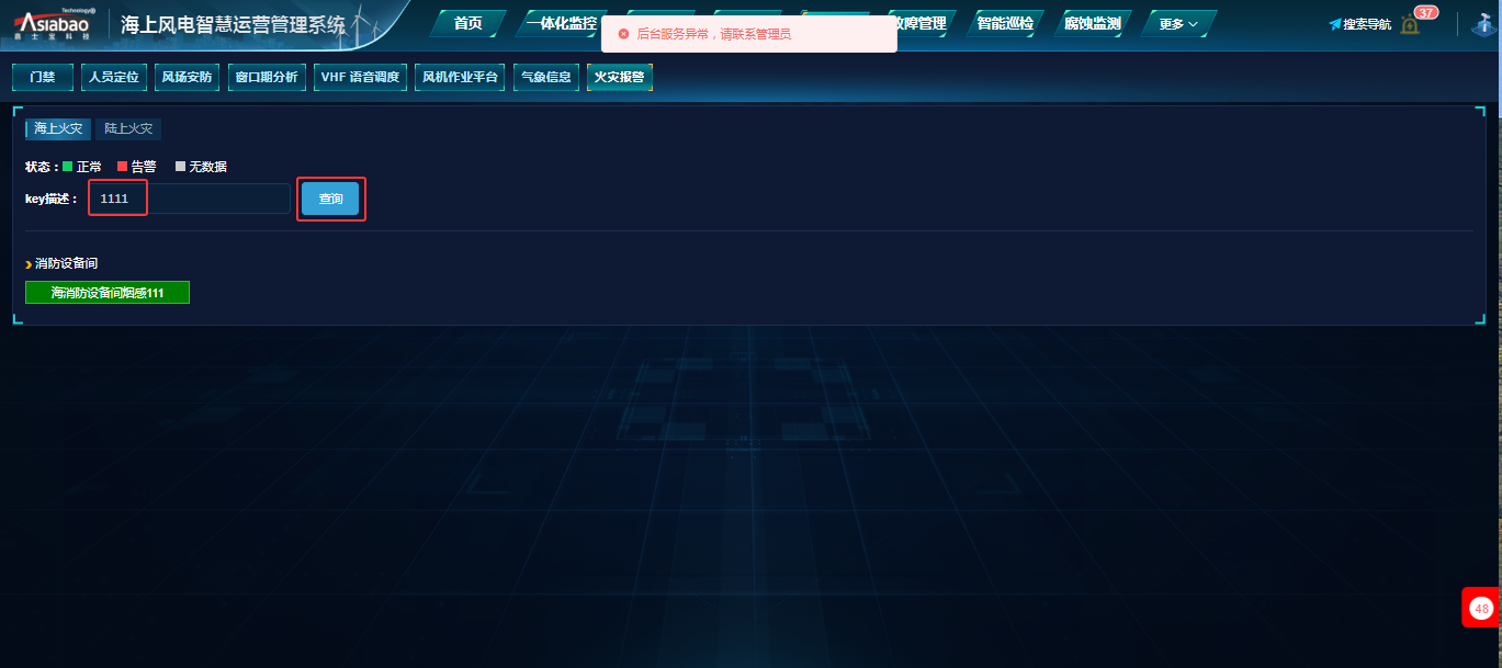 智能安防-火灾报警(海上火灾 / 陆上火灾):在海上火灾 或 陆上火灾页面,输入信息,点击‘查询’按钮后,出现提示‘后台服务异常,请联系管理员’。