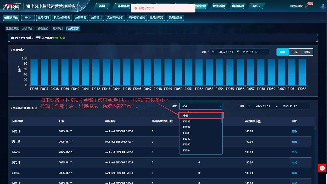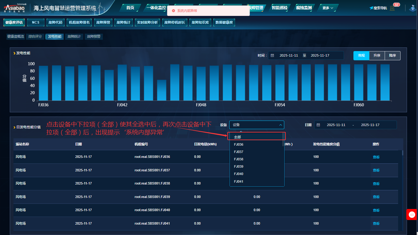 故障管理-健康度评估(发电性能):在发电性能页面,在日发电性能分值区域,点击设备中下拉项(全部)使其全选中后,再次点击设备中下拉项(全部)后,出现提示‘系统内部异常’。