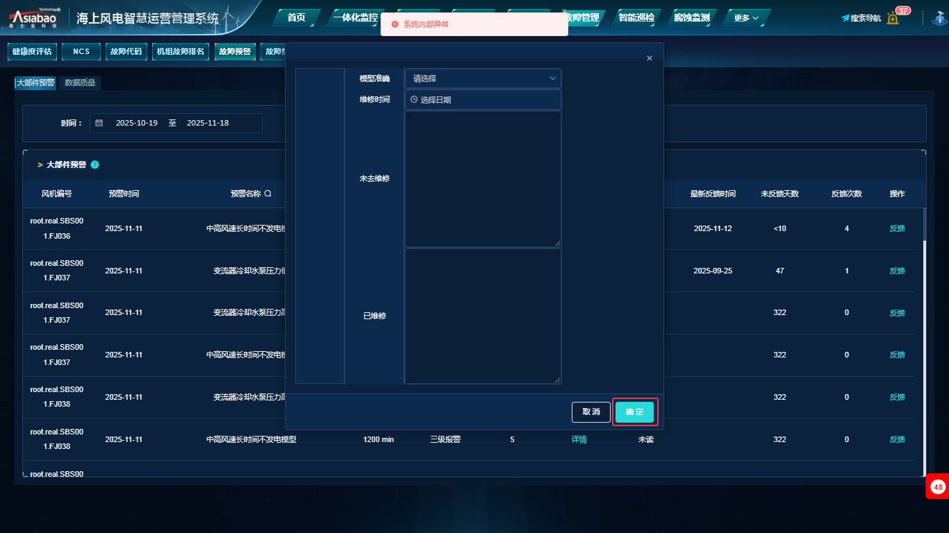 故障管理-故障预警(大部件预警-反馈):在大部件预警页面,点击操作‘反馈’按钮出现弹窗;在弹窗中,点击‘新增’按钮,出现弹窗;在弹窗中,直接点击‘确定’按钮后,出现提示‘系统内部异常’。