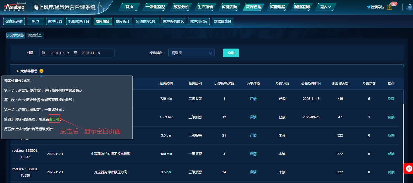 故障管理-故障预警(大部件预警):在大部件预警页面,点击大部件预警浮层中‘窗口期’后,显示空白页面。