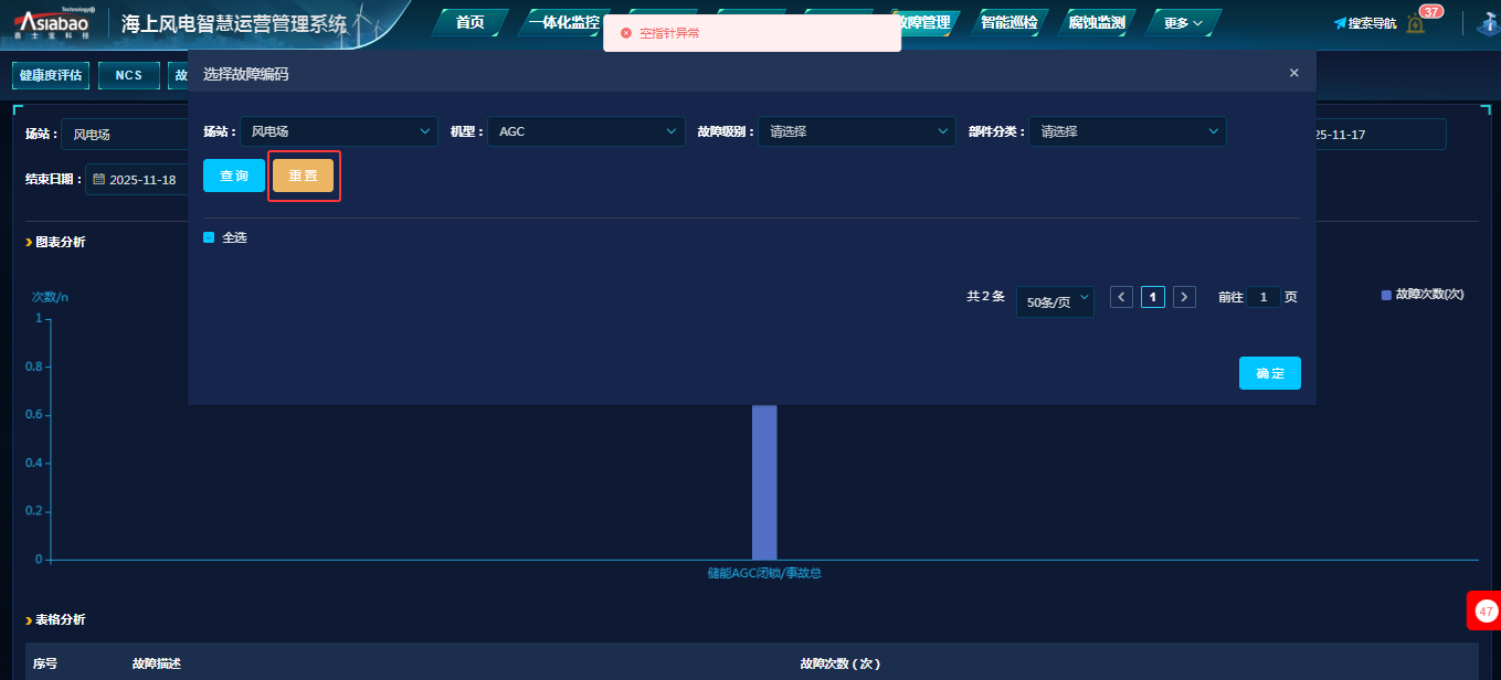 故障管理-故障统计(选择故障编码):在故障统计页面,选择故障代码弹窗中,点击‘重置’按钮后,出现提示‘空指针异常’。