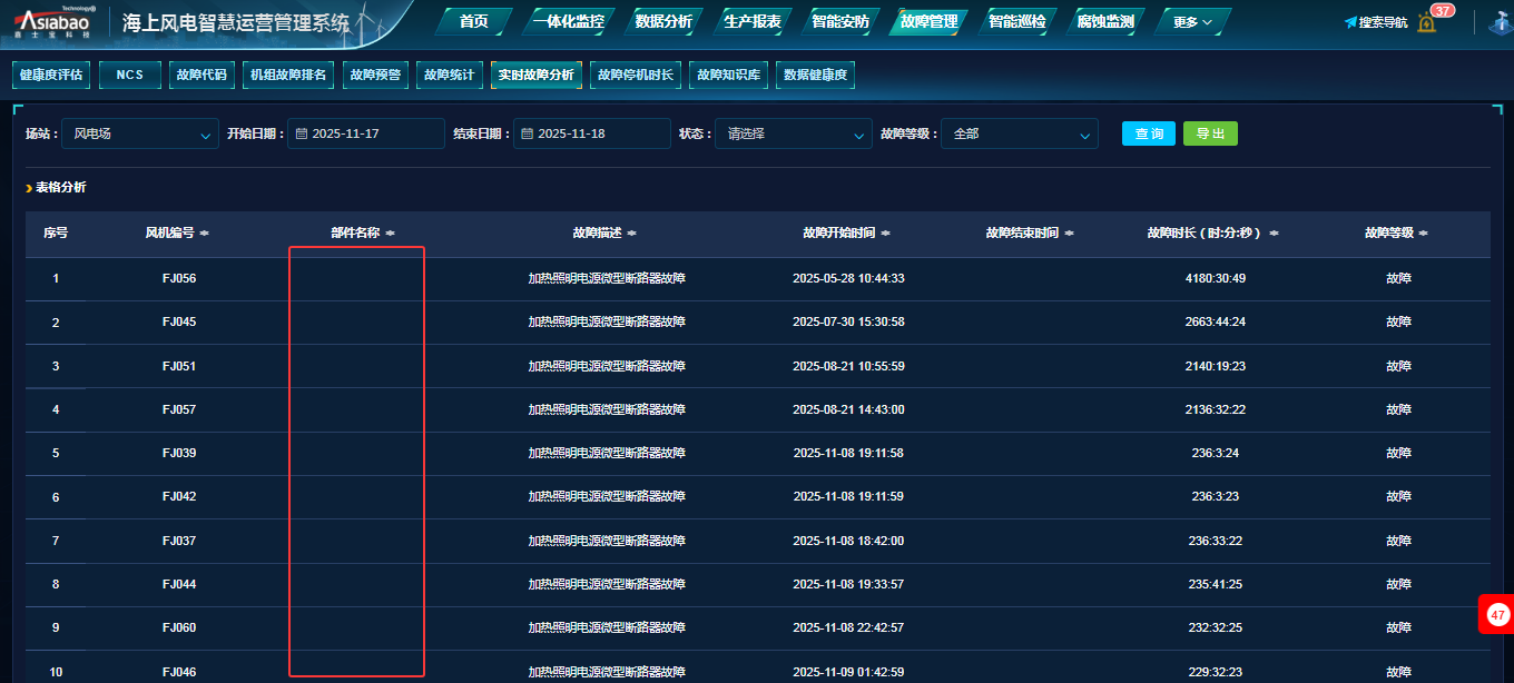 故障管理-实时故障分析:在实时故障分析页面,列表中字段‘部件名称’的值均显示空。