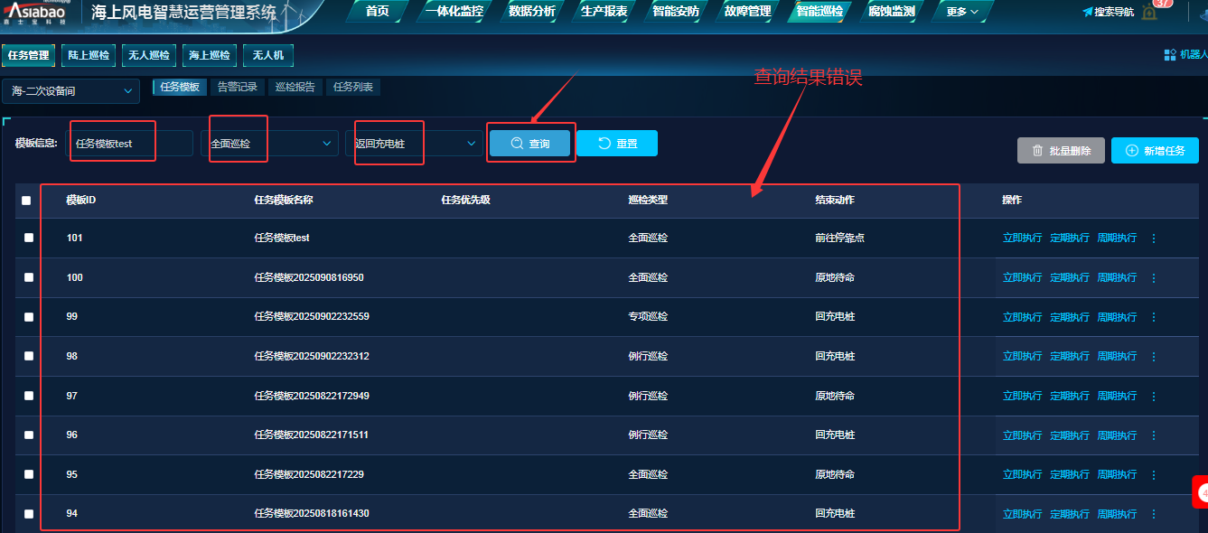 智能巡检-任务管理(任务模板)-查询:在任务管理的任务模板页面,查询结果错误。