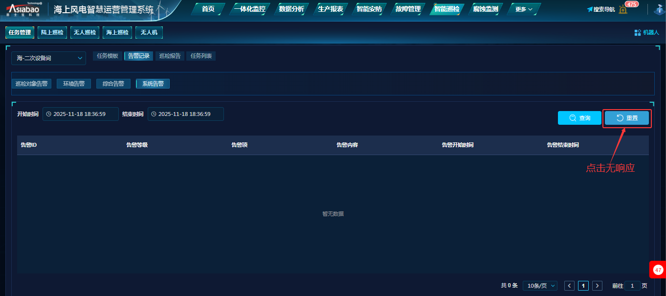智能巡检-任务管理(告警记录-系统告警):点击‘重置’按钮无响应。