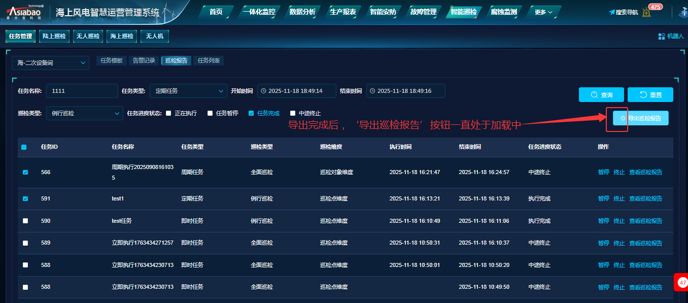 智能巡检-任务管理(巡检报告):在巡检报告页面,点击‘导出巡检报告’按钮,导出完成后,‘导出巡检报告’按钮一直处于加载中。