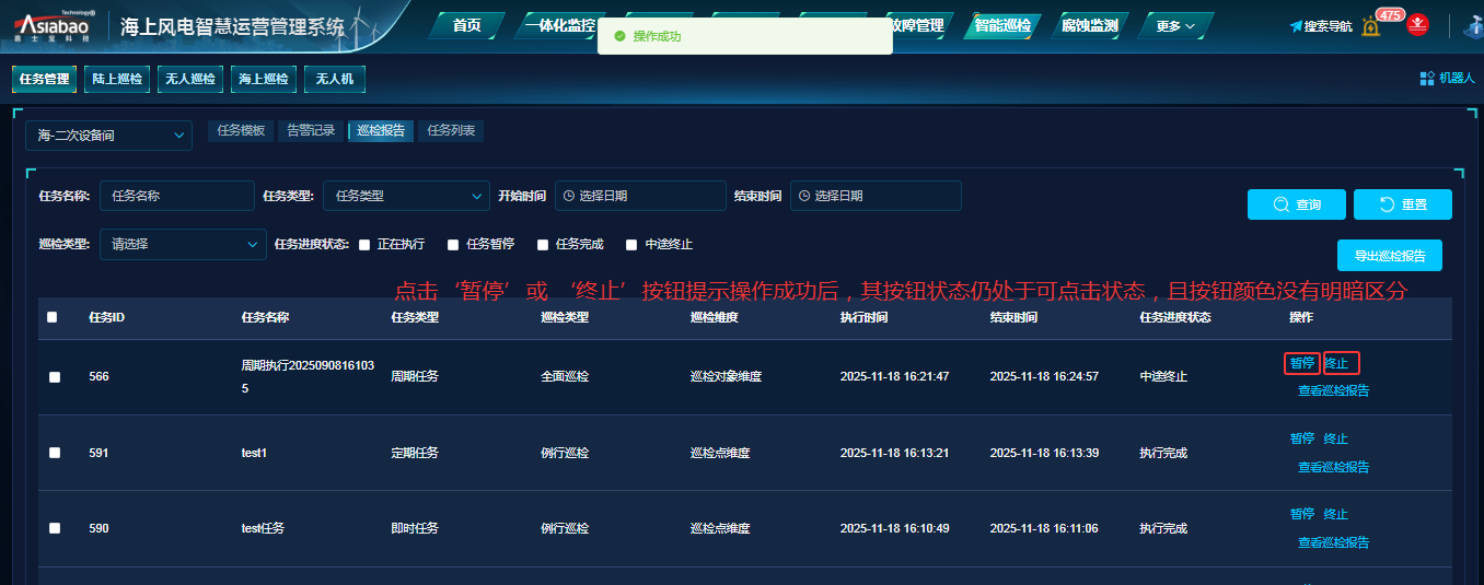 智能巡检-任务管理(巡检报告):在巡检报告页面,点击‘暂停’或 ‘终止’按钮提示操作成功后,其按钮状态仍处于可点击状态,且按钮颜色没有明暗区分。