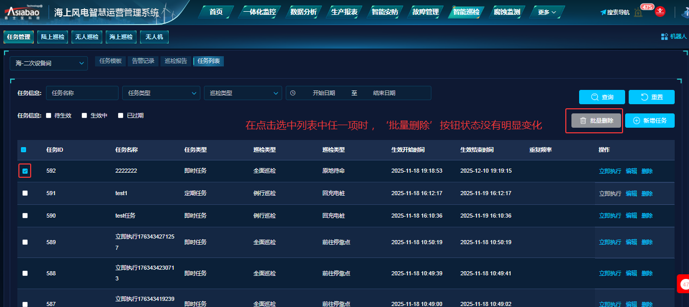 智能巡检-任务管理(任务列表)-批量删除:在点击选中列表中任一项时,‘批量删除’按钮状态没有明显变化。