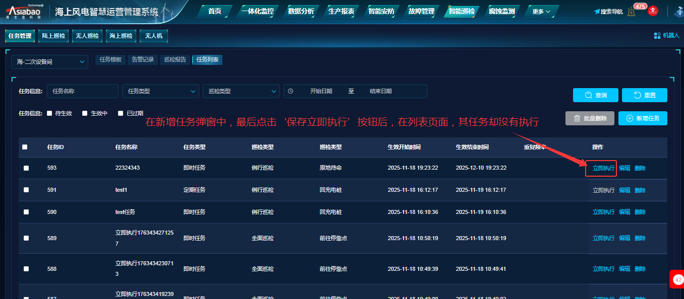 智能巡检-任务管理(任务列表)-新增任务:在新增任务弹窗中,最后点击‘保存立即执行’按钮后,在列表页面,其任务却没有执行。