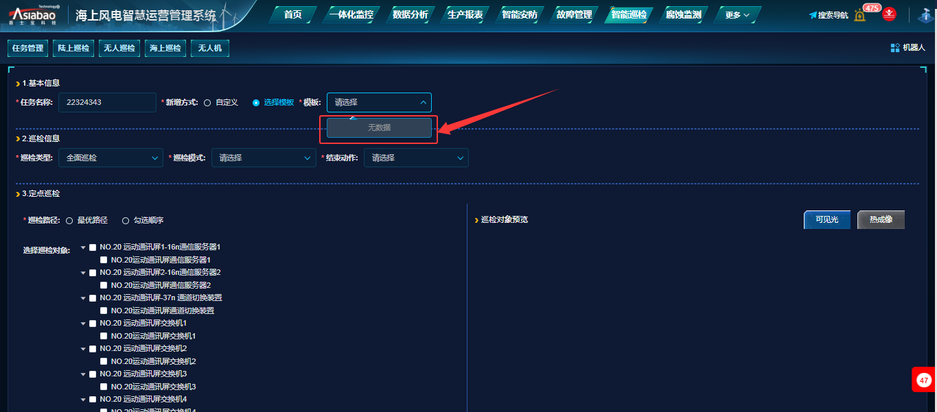 智能巡检-任务管理(任务列表)-新增任务:在新增任务弹窗中,点击选择模板时,模板下拉项中却展示无数据。