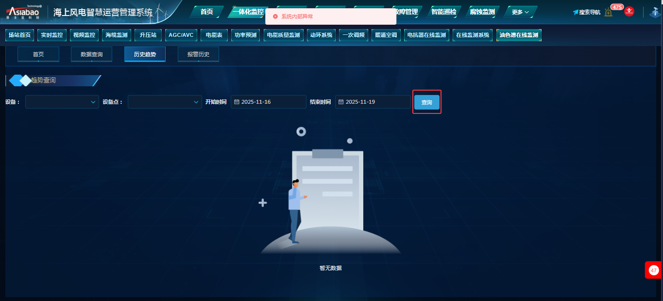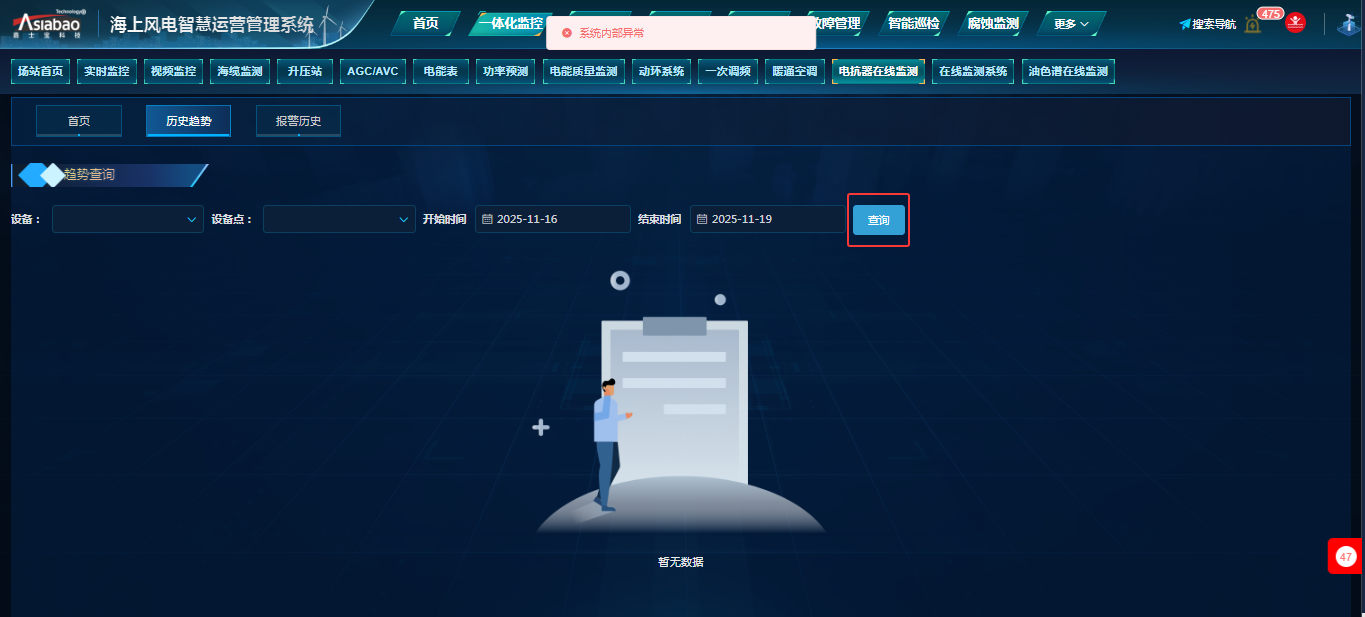 一体化监控-(电抗器在线监测、油色谱在线监测)-历史趋势:在电抗器在线监测 或 油色谱在线监测的历史趋势页面,点击‘查询’按钮后,均出现提示‘系统内部异常’。