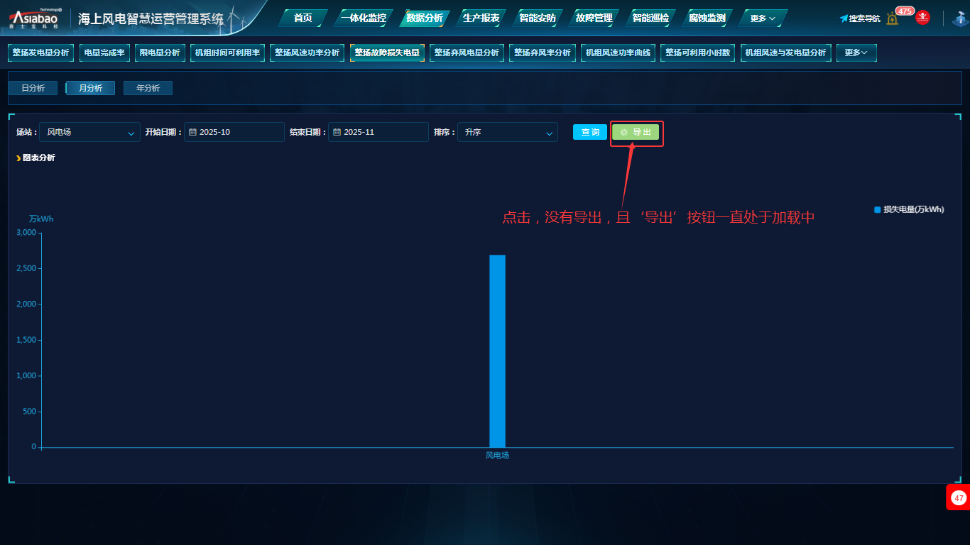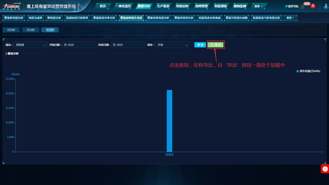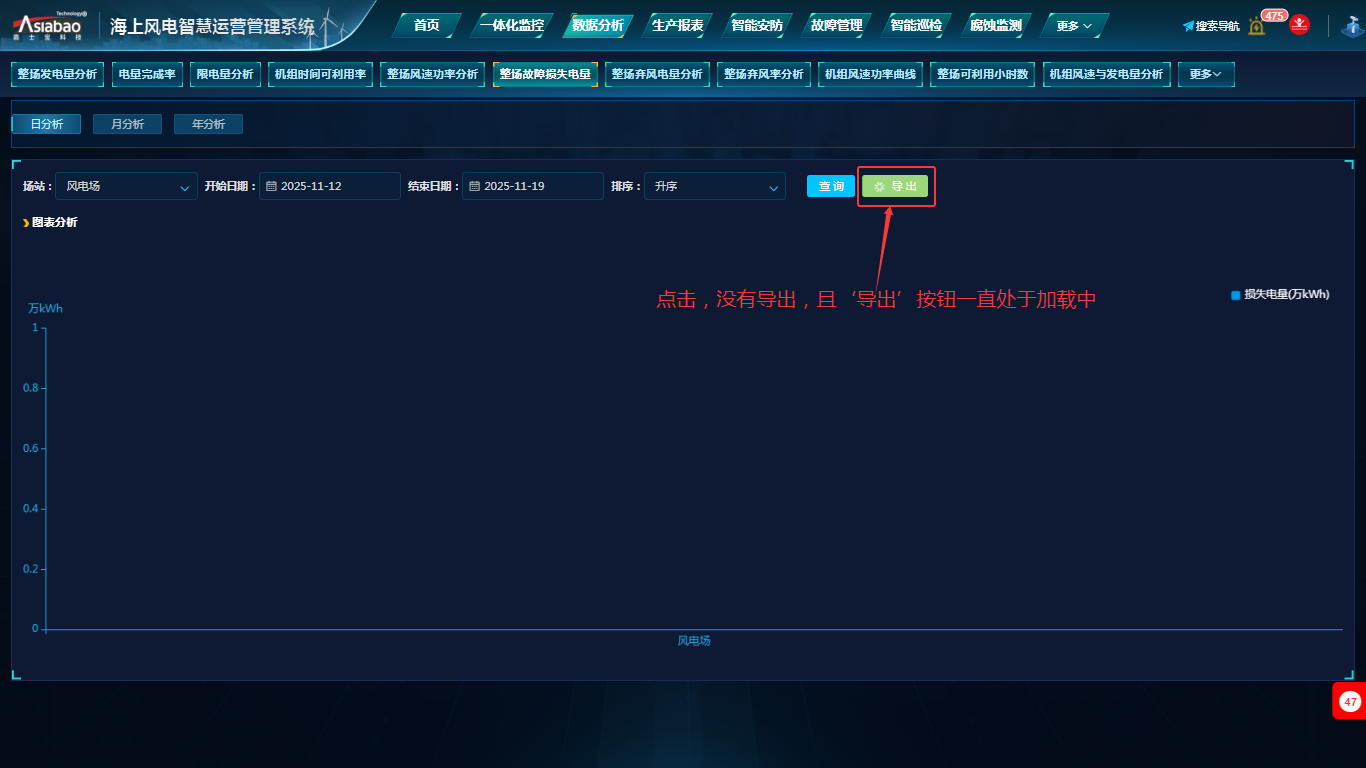 数据分析-整场故障损失电量(日分析/月分析/年分析):点击‘导出’按钮,没有导出,且‘导出’按钮一直处于加载中。