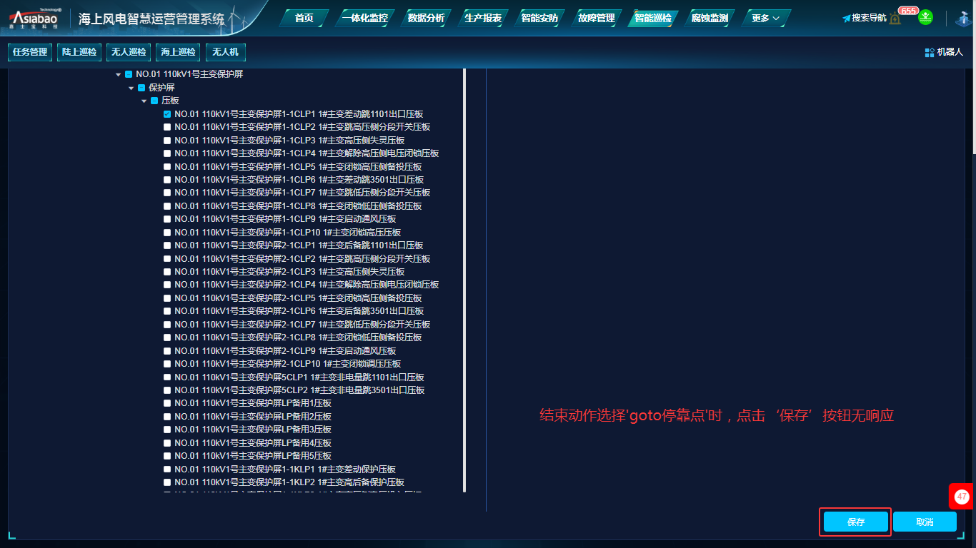 智能巡检-任务管理-任务模板-新建模板:在新建模板,结束动作选择'goto停靠点'时,点击‘保存’按钮无响应。