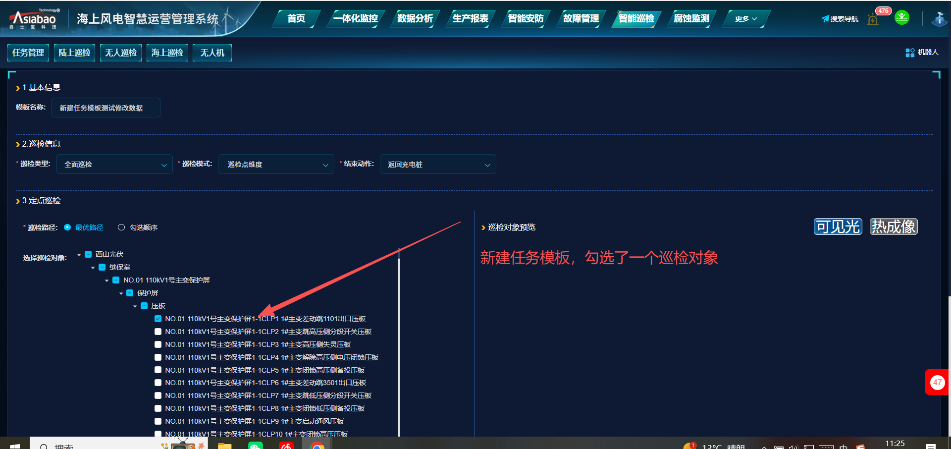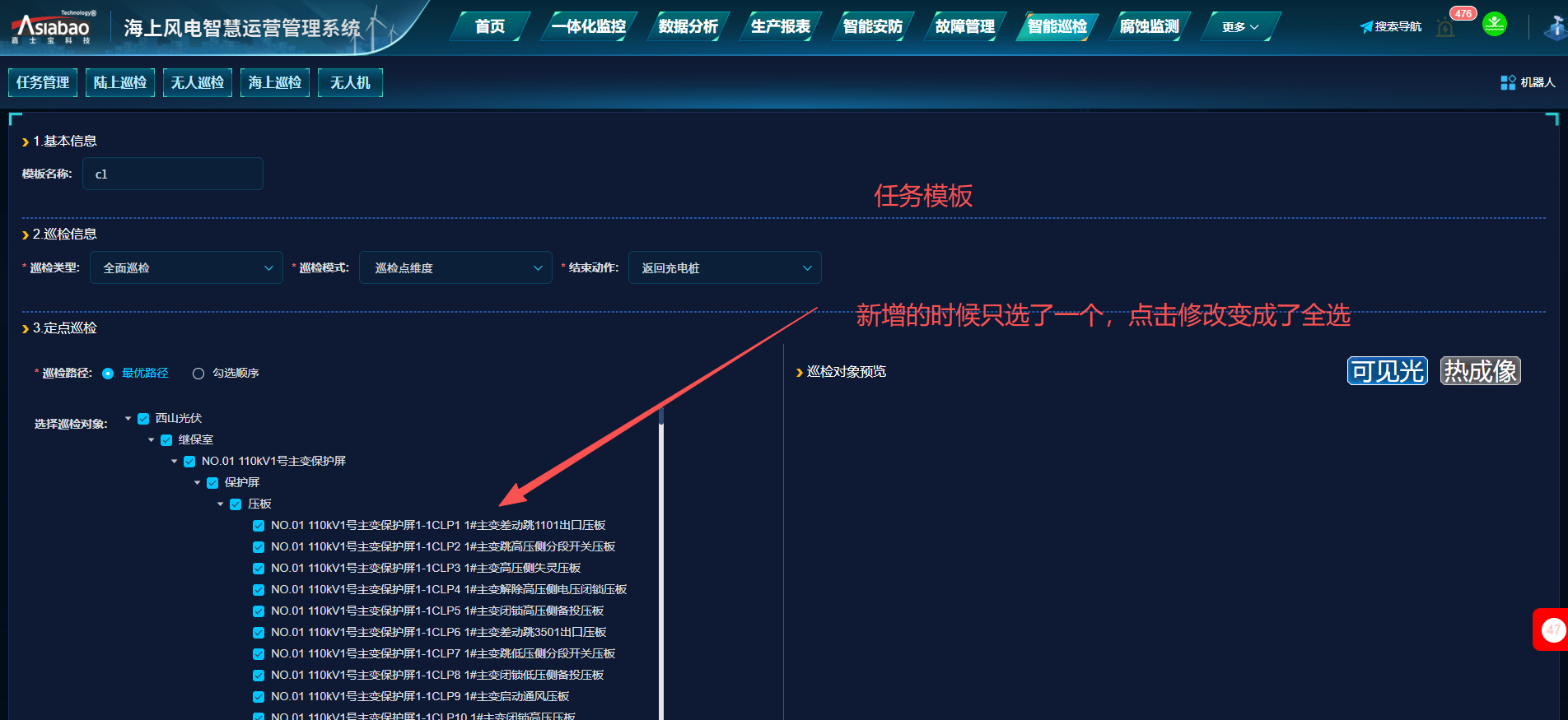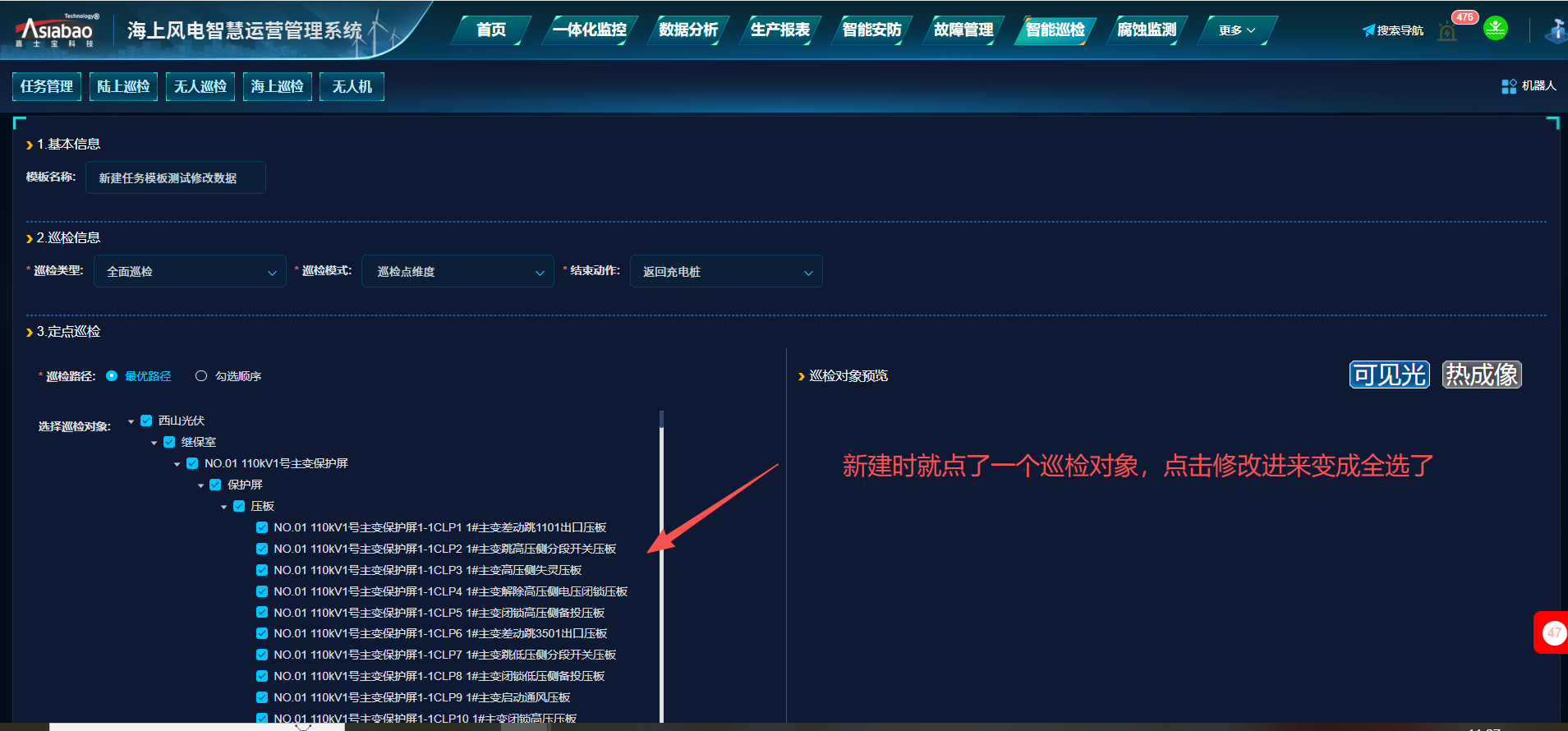 智能巡检-任务管理-任务模板:新增任务后,再点击修改,数据显示不对(巡检对象新建时就选了一个,再点击修改时变成全选了)