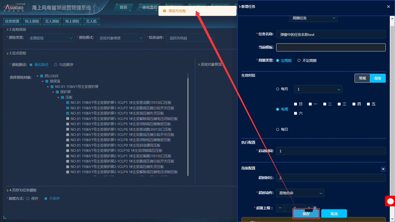 智能巡检-任务管理-任务列表-新增任务:在增任务页面,其中生效时段选择‘高级’时, 点击‘保存’按钮后,却出现提示‘请填写完整’。