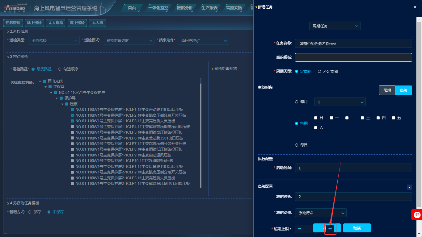 智能巡检-任务管理-任务列表-新增任务:在增任务页面,其中生效时段选择‘高级’时,出现超级上限的‘+’按钮会遮挡‘保存’按钮的情况。
