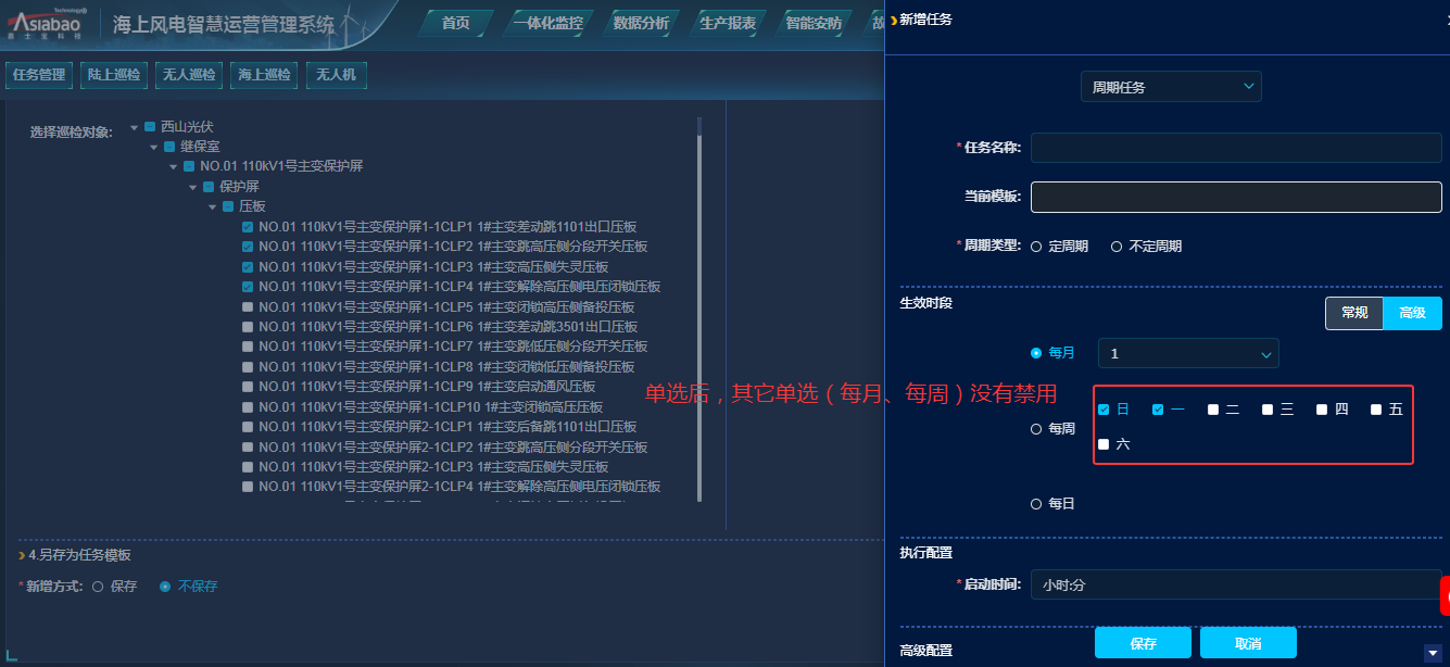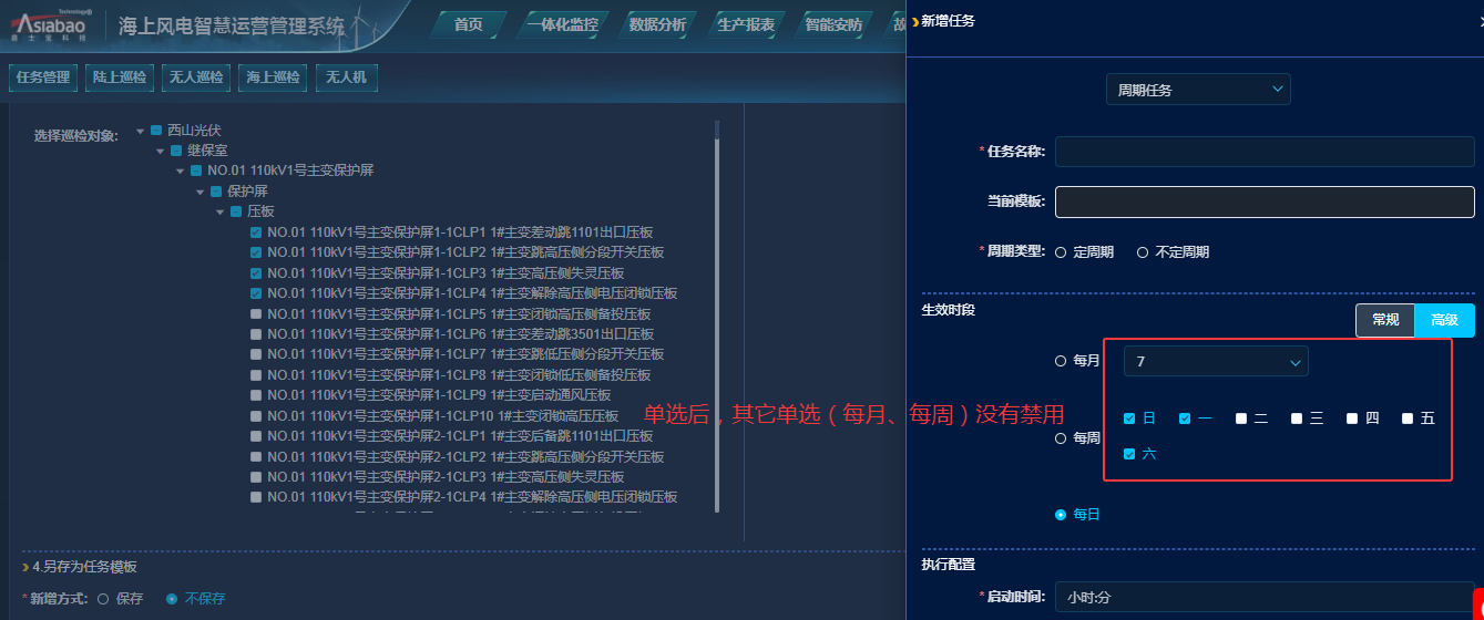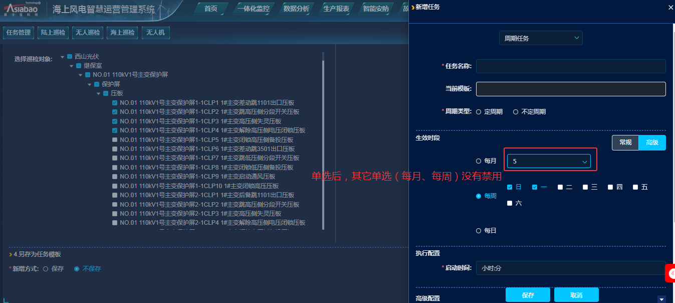 智能巡检-任务管理-任务列表-新增任务:在新增任务页面,生效时段选择‘高级’时,单选后,其它单选(每月、每周)没有禁用。