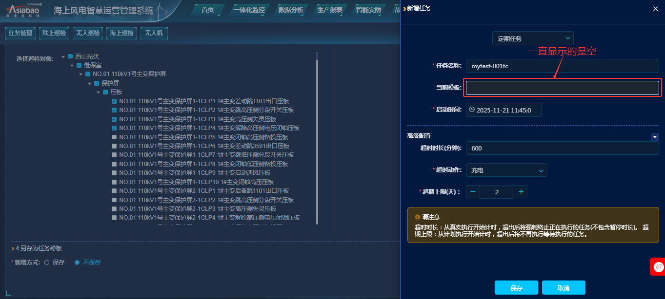 智能巡检-任务管理-任务列表-新增任务:在新增任务页面,‘当前模板’文本框的值,一直显示的是空。