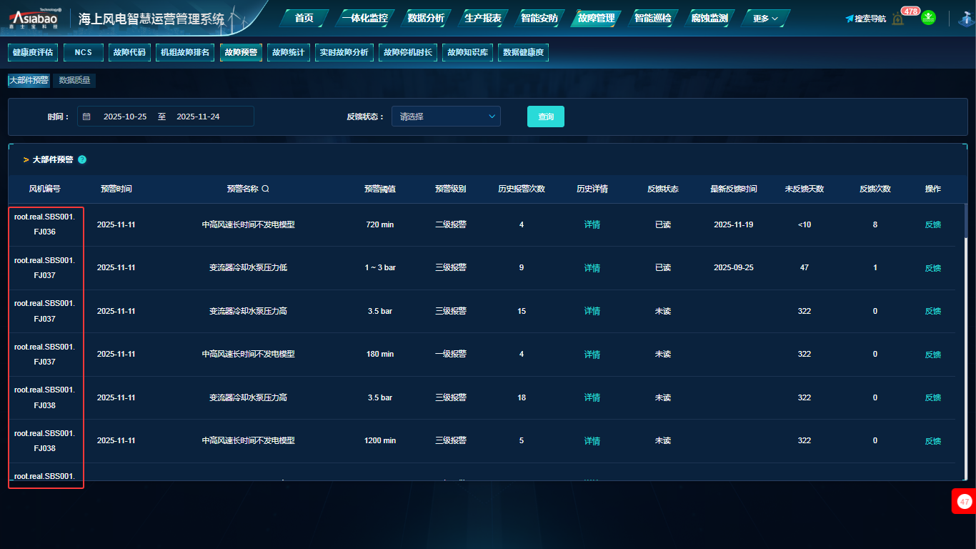 故障管理-故障预警(大部件预警):列表中风机编号显示错误(root.real.SBS001.FJ036)。